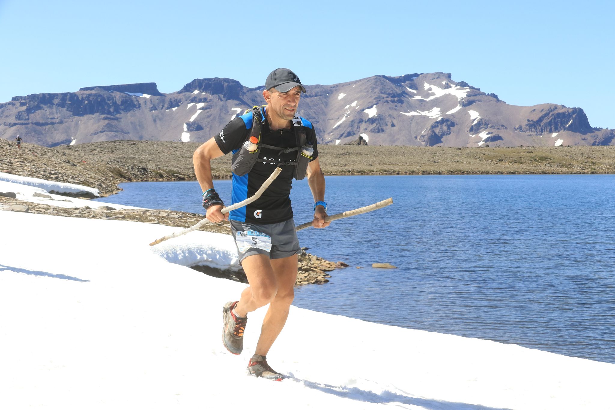 Ya en el segundo campamento, mientras charlábamos de la última etapa que se aproximaba, Nelson ya había estudiado la altimetría del circuito. Yo nila había visto, si total para mí es como leer ruso. El tema es que me dijo: “mañana agarrate dos bastones”. No me animé a preguntar de dónde agarrarlos. Pero a poco de largar y con 14 km de ascenso continuo por delante, Nelson agarró dos cañas del piso y yo para esa altura había aprendido a copiar todo. Caminando o corriendo suave, cada vez me iba acostumbrando más y ayudando mejor con esos bastones que tomamos prestados de la madre naturaleza. Y lo mejor de todo, llegar a la cima, ver una postal increíble, impresionante, inolvidable de la cordillera, y antes de empezar a descender rumbo a la meta, tirar los bastones a la mierda. Ahorasí, tercera gran lección: hacete una escalera en la nieve.